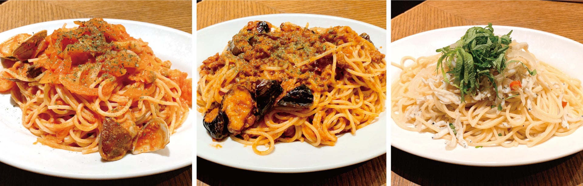 (左から)魚介のニンニクトマト・茄子ミートソース・大葉シラス