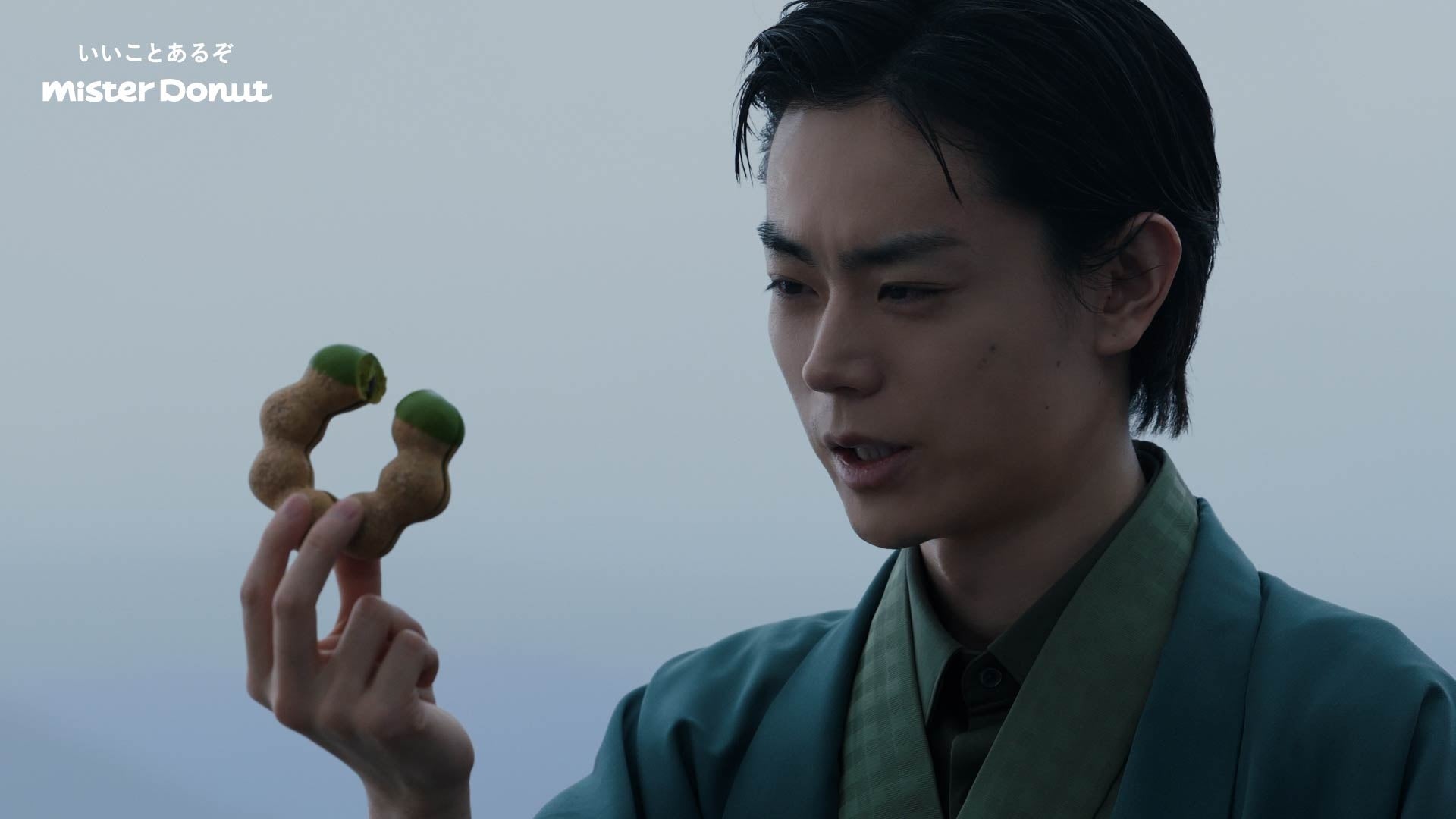 今回の新TVCMの舞台は、絶景に囲まれた水上に浮かぶ石畳。厳かな雰囲気の和の空間で“野点(のだて=野外でお茶をたてること)”をたしなむ菅田さんが、新商品「ポン・デ・濃い抹茶ホイップ あずき」をひと口食べた瞬間、「濃い!」とホイップの濃さに驚きます。実感のこもった感想を語るストーリーを通じて、お茶を練り込んだドーナツ生地に、それぞれ濃い抹茶ホイップ、濃いほうじ茶ホイップを加えた「ポン・デ・濃い抹茶ホイップ あずき」「米粉ドーナツ 濃いほうじ茶ホイップ」など、宇治抹茶や宇治ほうじ茶を楽しめる5つの商品の魅力を訴求していきます。