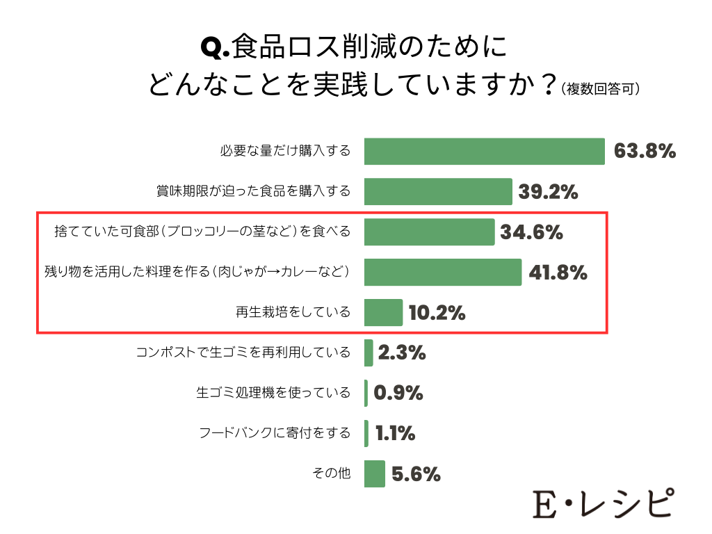 - 食品ロス削減のために「捨てていた可食部を食べる」「再生栽培をしている」など、食材を使い切る傾向
