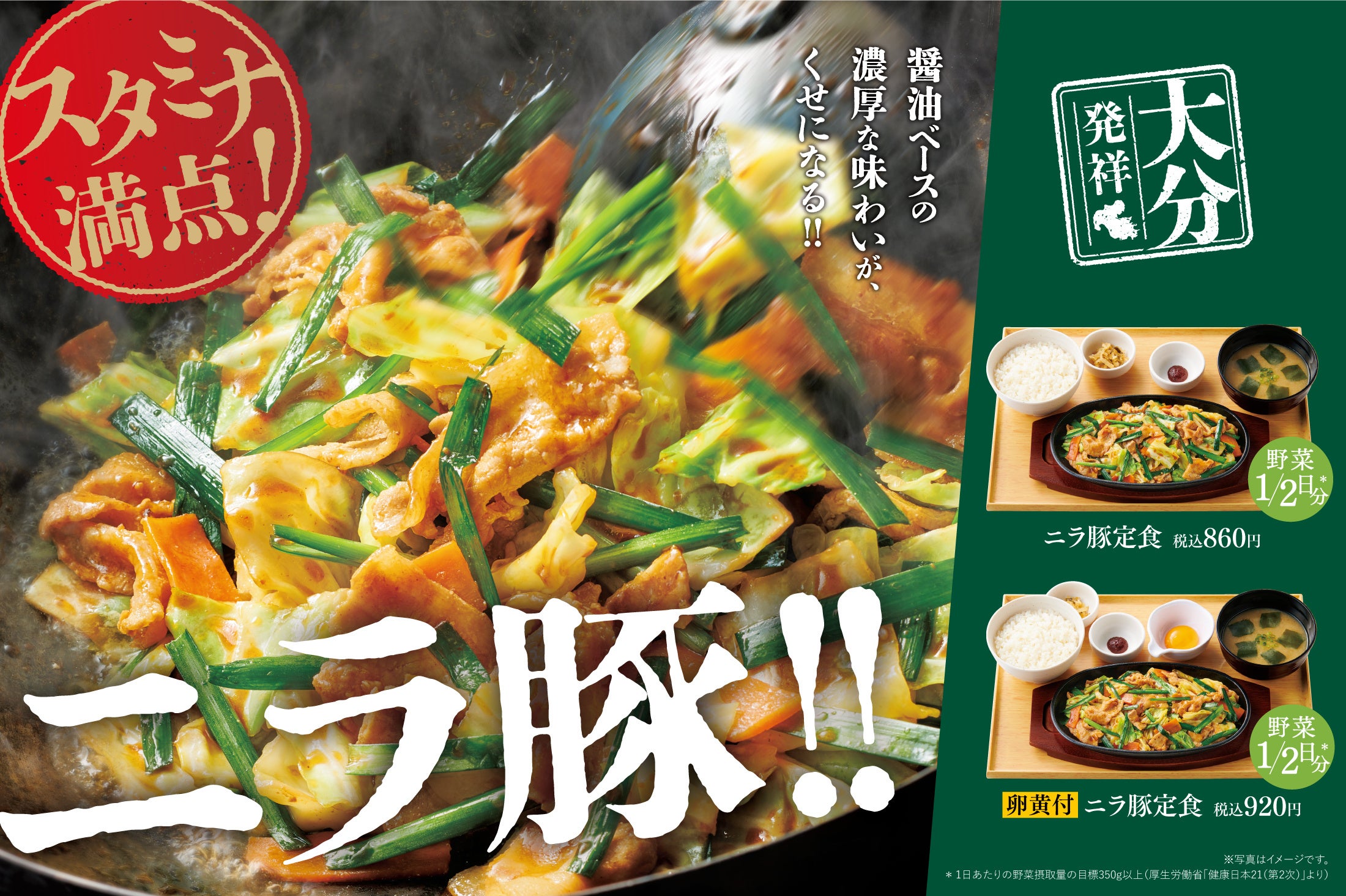 『ニラ豚定食』は豚肉・ニラに加えて、キャベツなどの野菜を、豆板醤や赤唐辛子などをブレンドした醤油ベースのたれで炒めました。少し濃いめの味付けは、ごはんとの相性も抜群です。また、1日に必要な野菜量の1/2※1を摂ることができ、野菜たっぷりの満足感を得られます。『【卵黄付】ニラ豚定食』は、卵黄を絡めていただくことで、優しくまろやかな味わいをお楽しみいただけます。さらに、ごはんの量が無料で普通盛、大盛、超特盛から選べるテイクアウト『おうち定食』でも発売いたします。おうちや職場でも大分発祥のスタミナメニューをお楽しみください。