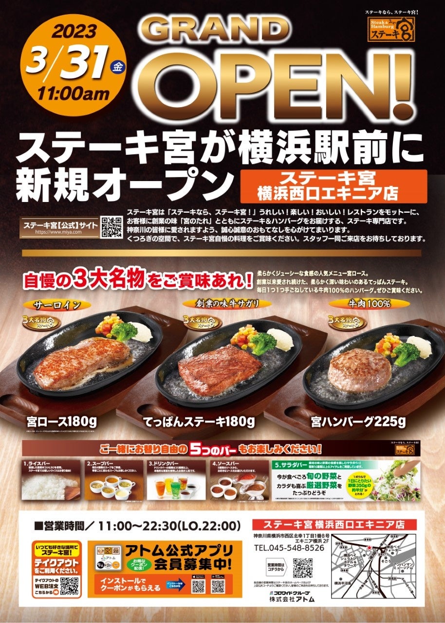 コロワイドグループの株式会社アトム(本社:神奈川県横浜市、代表取締役社長:山角豪)は、2023年3月31日(金)神奈川県横浜市に神奈川県で3店舗目となる「ステーキ宮横浜西口エキニア店」をオープンいたします。この出店により「ステーキ宮」は全国で124店舗となります。