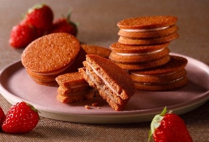 期間限定の人気の季節味。5層仕立てのキャラメルチョコレートクッキーにイチゴの美味しさをギュッと閉じ込めました。おばけ自慢のキャラメルと甘酸っぱいイチゴが相性抜群です。
