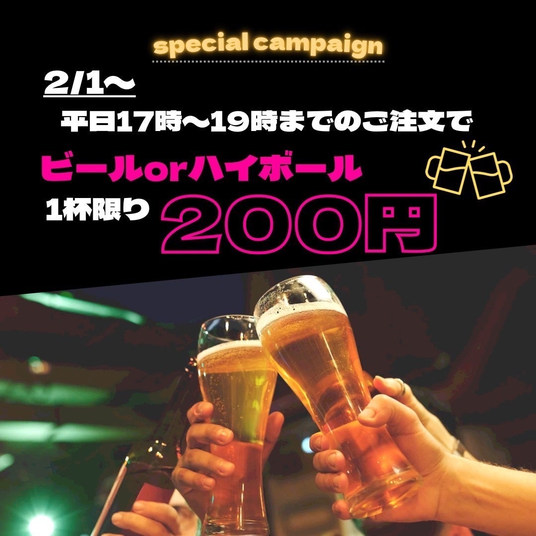 - 【ハッピーアワー】ビールorハイボール 1杯限り200円