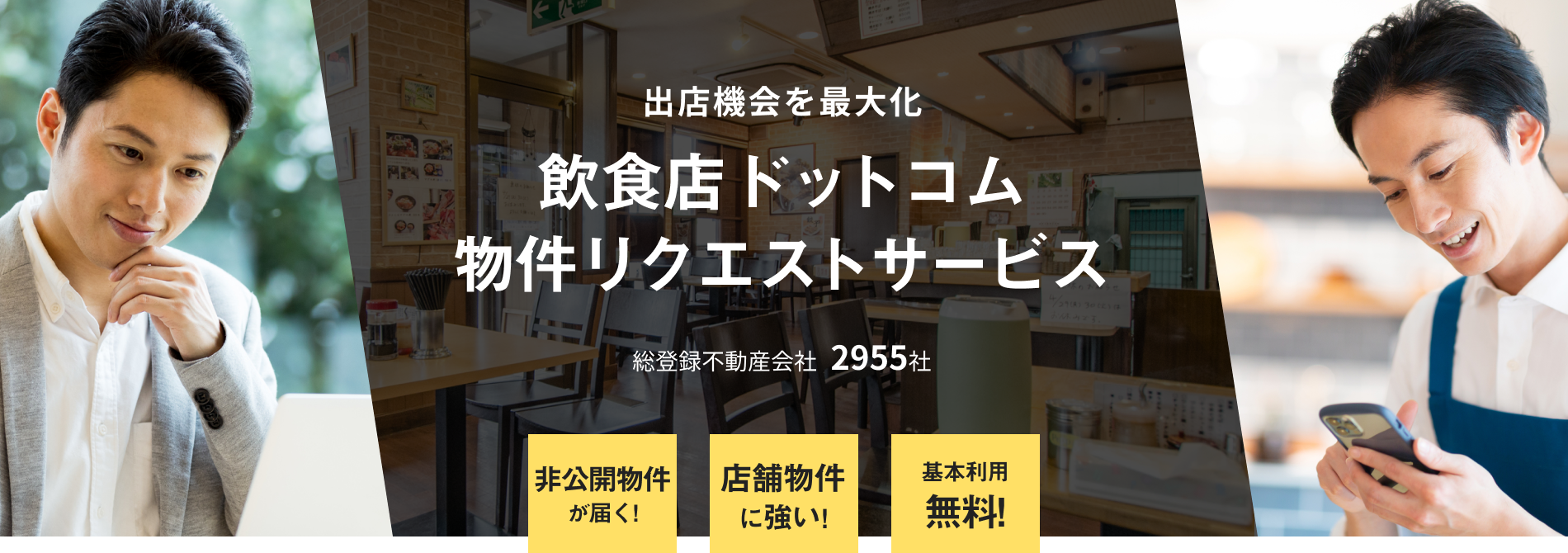 飲食店の出店希望者の登録した希望条件と、不動産会社・貸主の貸したい店舗物件をマッチングするサービス。Webサイトに掲載せずに物件情報をお届けできるため、これまで営業中であるなどの理由でWebサイトに掲載できなかった物件や、不動産会社の顧客内で決まってしまっていた物件などの希少性の高い物件情報を「非公開物件」として受け取る機会を得ることができます。