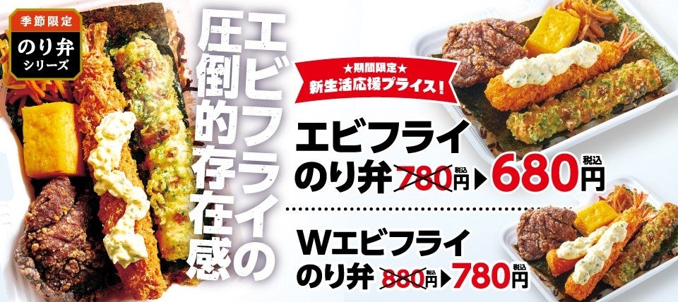 揚げたてから揚げとテリー伊藤こだわりの玉子焼き「から揚げの天才」は、2023年4月1日(土)~エビフライのり弁を680円(税込)で販売いたします。圧倒的存在感のあるエビフライをダブルでご用意したWエビフライのり弁は780円(税込)です。大人気の「季節限定のり弁シリーズ」は今回で第3弾となります。新生活を迎える人を少しでも応援したいという思いから、「期間限定 新生活応援プライス!」として通常価格の100円引きで販売致します。さらに、ライスの量はお値段そのままでお選びいただけます。期間限定の今だけ価格となっておりますので是非ご賞味ください。