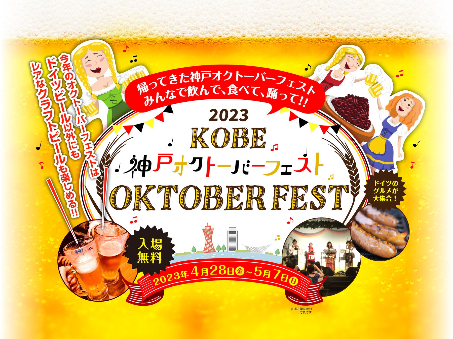 神戸オクトーバーフェスト実行委員会は「神戸オクトーバーフェスト2023」を4月28日(金)~5月7日(日)、 神戸ハーバーランドumie・モザイク前の高浜岸壁にて開催いたします。