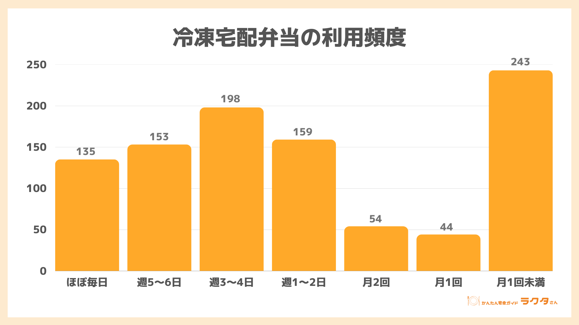 ナイル株式会社(本社:東京都品川区、 代表取締役社長:高橋飛翔、 以下ナイル)が運営する「かんたん宅食ガイド ラクタさん」にて、冷凍宅配弁当サービスを利用している・利用したことのある10代~60代男女986人を対象に、2023年3月17日~3月24日の期間で、冷凍弁当の利用頻度に関するアンケートを実施しました。