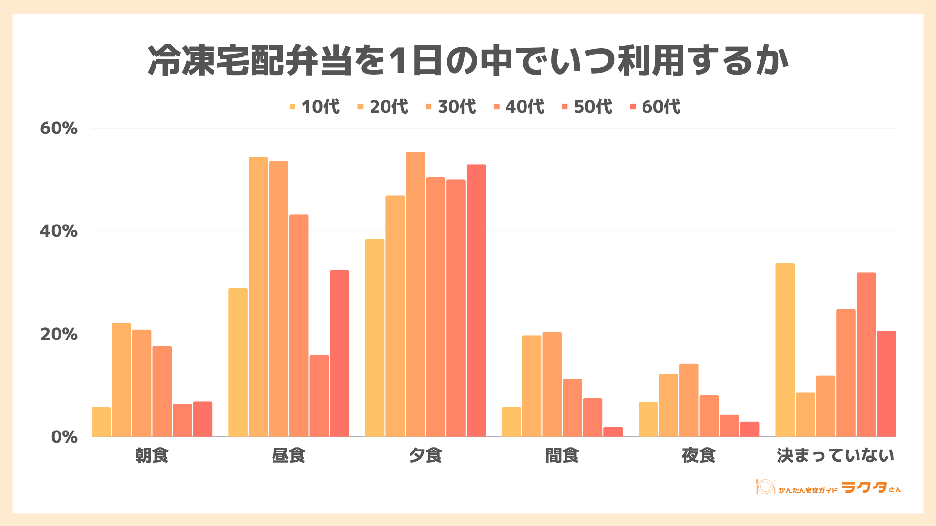 - 半数近くが夕食または昼食で冷凍弁当を利用。