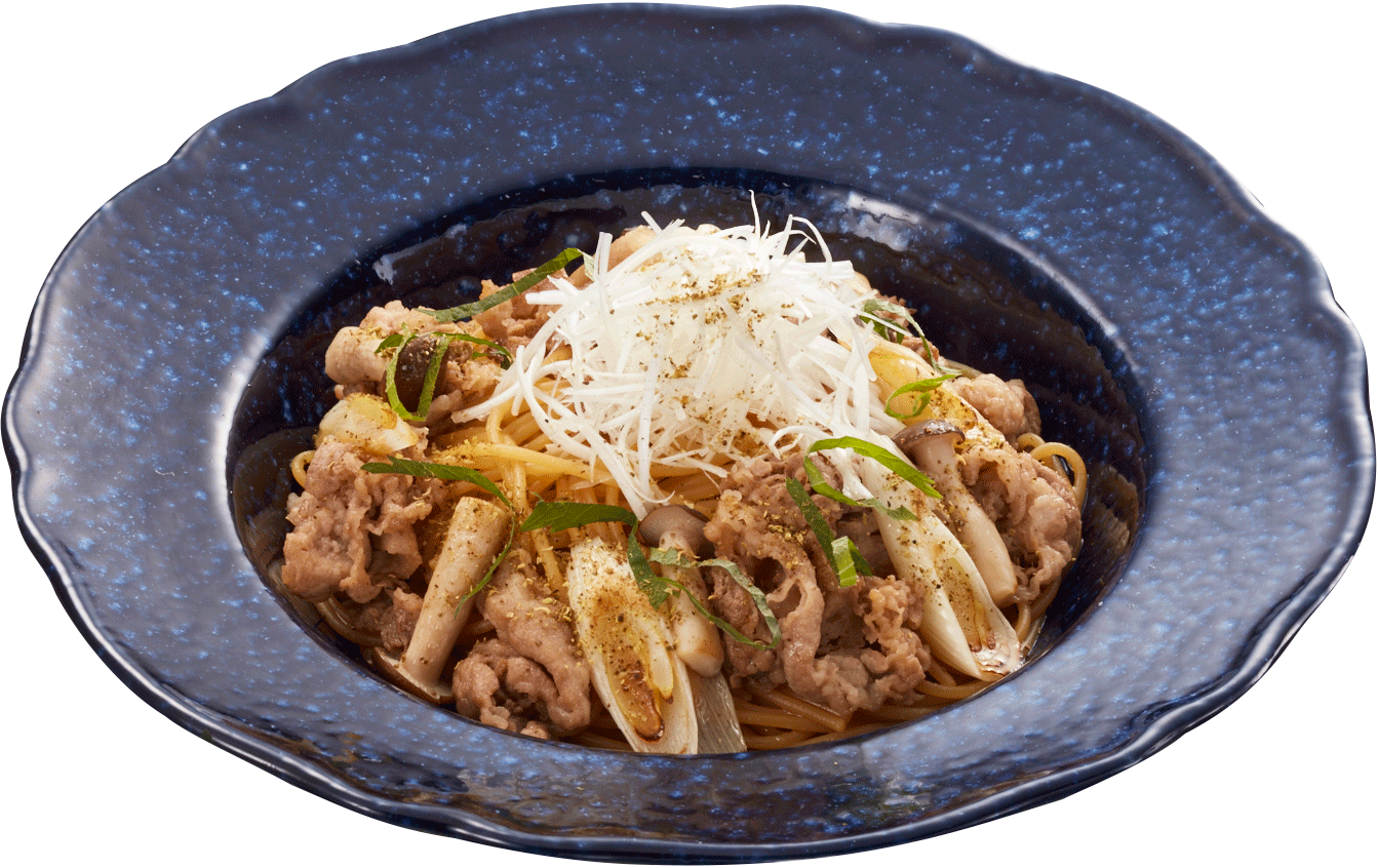 牛肉や長ネギ、しめじを使用した、醤油ベースの甘辛いパスタです。白髪ねぎと山椒をトッピングし、しびれる辛さが特長の大人な味わいに仕上げました。お好みのタイミングで温泉卵入りの野菜だしを合わせ、マイルドな味わいへの変化をお楽しみください。