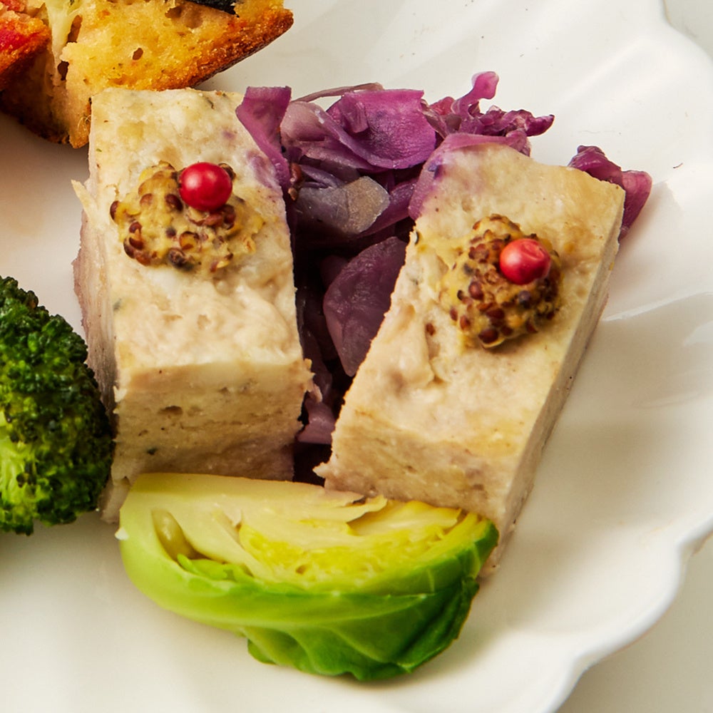 紫キャベツの赤ワイン風味 スパイスを練り込んで焼き上げたパテにマスタードのアクセント。 赤ワイン、ワインビネガーで蒸し煮にした色鮮やかで甘酸っぱい紫キャベツと共に。