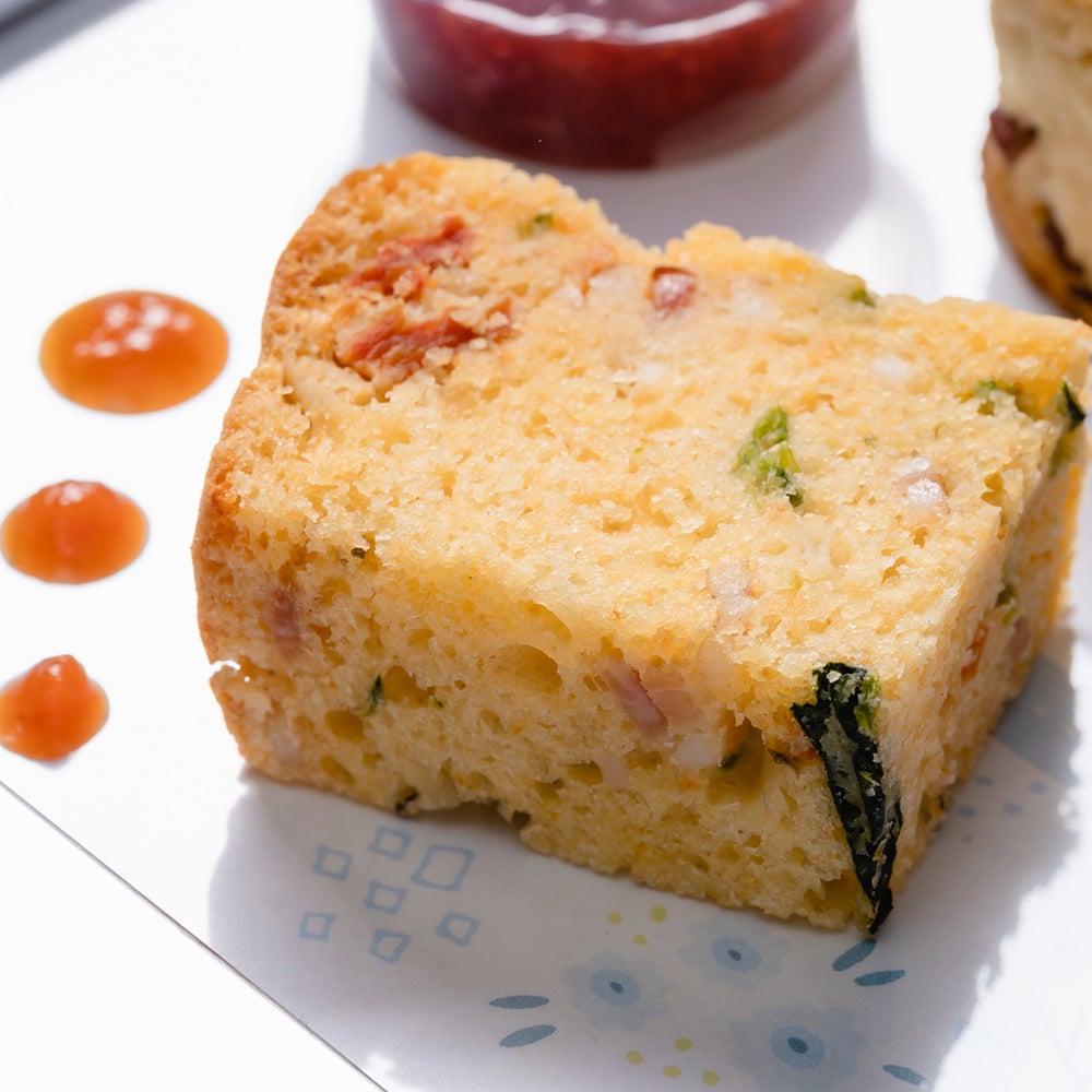 ケークサレとはフランス語で、『塩味のケーキ』という意味です。 じっくりと飴色になるまでソテーしたオニオン、ベーコン、ドライトマト、オリーブ、ほうれん草と焼き上げました。