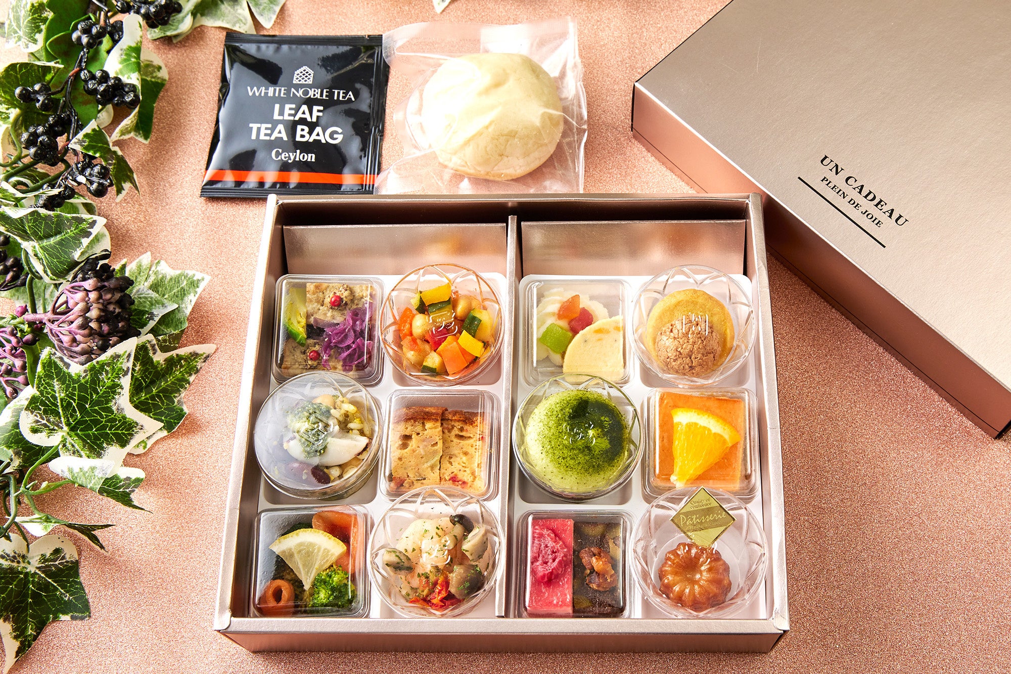 メリエンダとは、アフタヌーンティーに近い意味を持つ軽食やランチのことで、スペインやラテンアメリカの文化に根付いたものです。ピンクゴールドのかわいい箱に詰められ、全12種類の彩り豊かなオードブル/セイボリーとスイーツが入っています。