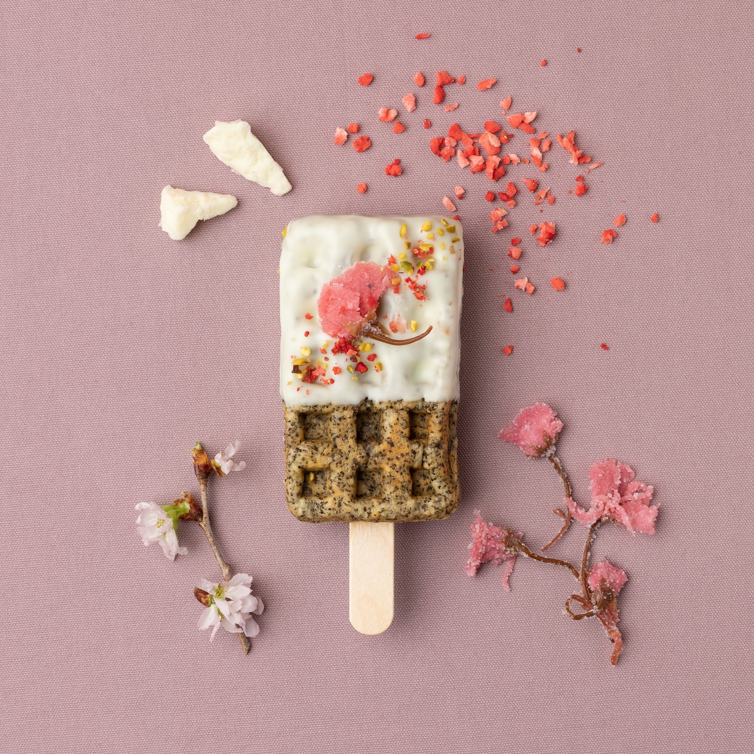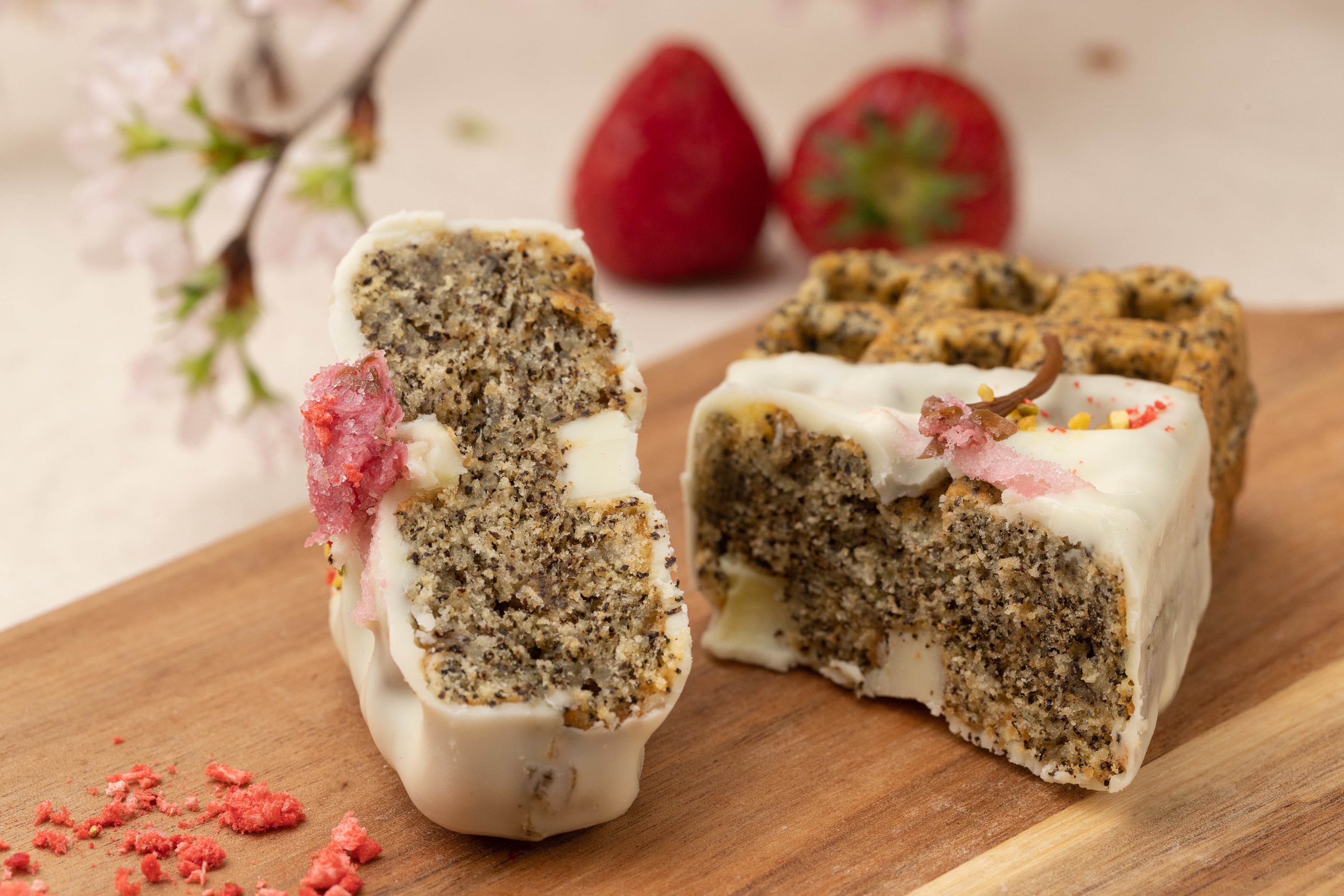 アールグレイの茶葉をたっぷり練り込んだ京ワッフルに、ホワイトチョコレートをディップし、ミルクティーのような味わいに。トッピングには、春の味覚である“桜”や”苺”を散りばめて春らしいビジュアル。