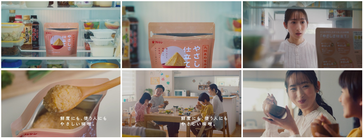 お母さんが冷蔵庫を開けると、ジッパー部分が口のように開き、「吾輩は味噌である。」と喋り出す「やさしさ仕立て」。一見味噌っぽくない形のパッケージですが、光を浴びず鮮度を保ちやすい素材で作られていることなど、この形こそが「美味しい味噌のミソ」であることを伝えます。「ねぇ、使っていい?」と話しかけたお母さんの手で、味噌汁となって食卓に届いた「やさしさ仕立て」。味噌汁を飲んだ家族からは笑顔がこぼれます。
