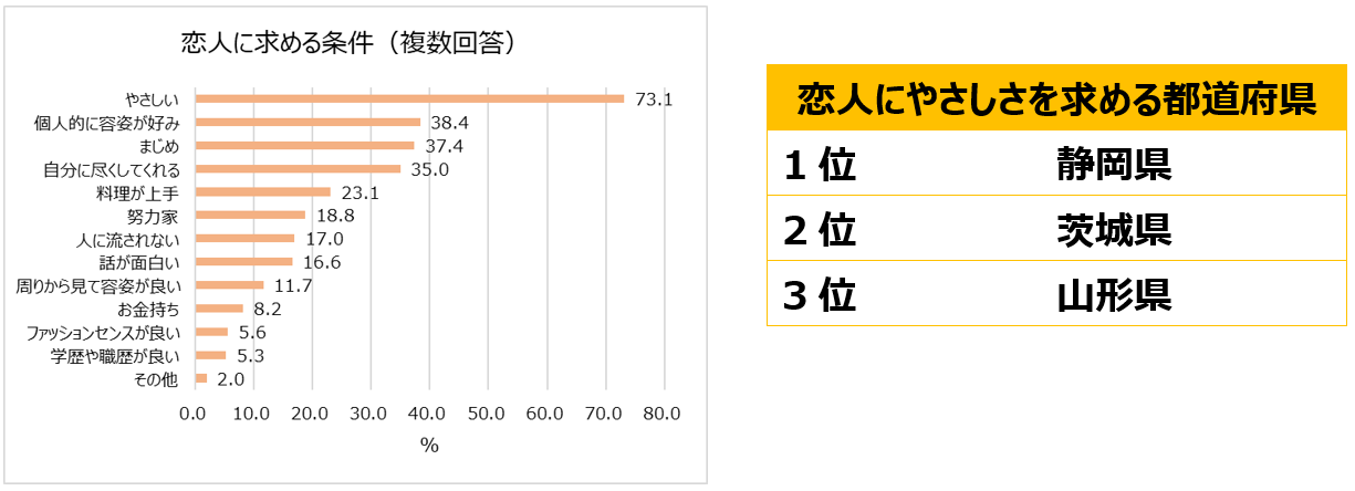 「やさしさ」は世の中でどれくらい重要視されているのかに迫るべく、一つの基準として「恋人に求める条件」も聞きました。その結果、「やさしい(73.1%)」が圧倒的1位に。「やさしい」と回答した人の割合が最も多かったのは「静岡県」、続いて「茨城県」「山形県」という結果でした。