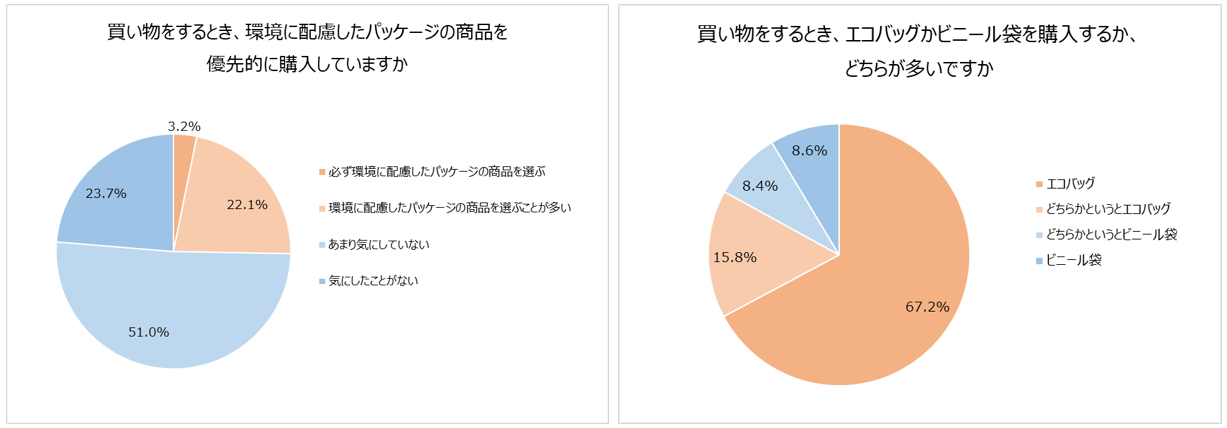 「環境へのやさしさ」についても調査を実施。買い物をするとき環境に配慮したパッケージの商品を必ず選ぶ人・選ぶことが多い人は25.3%と少数派。一方で、ビニール袋を購入するのではなくエコバッグを使用している人は8割以上でした。エコバッグの使用など、エコへの意識を持っている人は多いものの、パッケージなど細かいところまで気にしている人はまだ少ないことが分かりました。環境に配慮したパッケージにはどんなものがあるか知らない、という人も一定数いるかもしれません。
