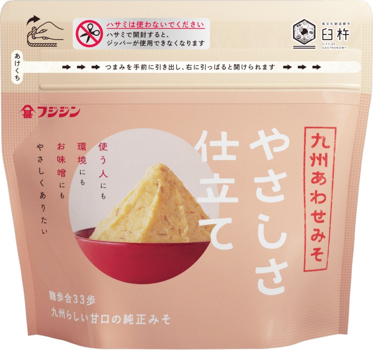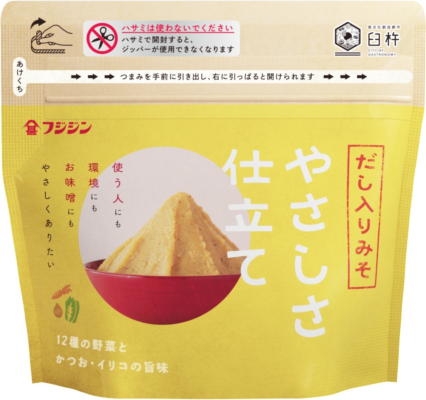2023年3月1日(水)に新発売した「ジップみそ やさしさ仕立て」シリーズは、ガゼット袋にジップをつけた、味噌としては珍しい形のパッケージが特徴。「ジップのないガゼット袋は開封後の保管がしづらい」、「カップは量が少なくなっても場所をとるし、蓋も外れ易い」というお客様の不満を解消するべく誕生しました。「食べる人へのやさしさ」「使う人へのやさしさ」「お味噌へのやさしさ」「環境へのやさしさ」の、4つのやさしさが詰まったお味噌です。