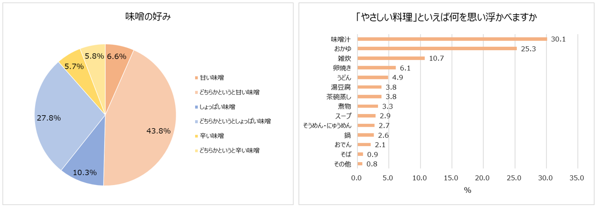 また、「やさしい料理」といえば何を思い浮かべるかも調査したところ、様々な料理をおさえて1位は「味噌汁」でした。味噌汁の味やあたたかさに、やさしさを感じている人、やさしさを求めている人は多いと考えられます。