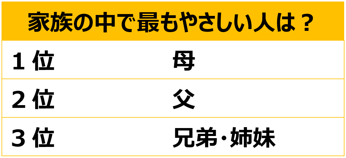 身近な存在として、家族の中で最もやさしい人は誰だと思うか聞いたところ、「自分」と回答した人を除くと「母」が特に多い結果になりました。