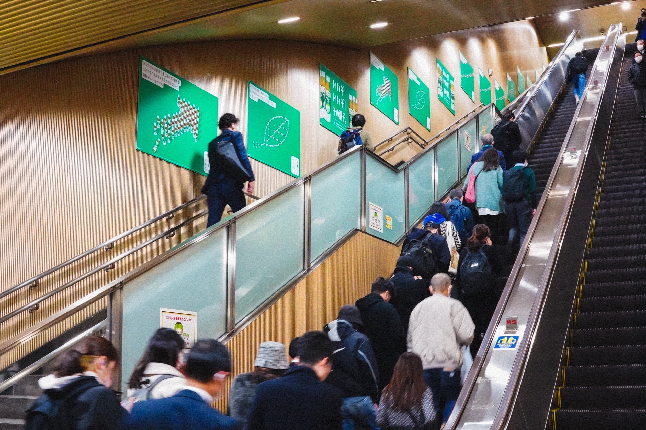 都営大江戸線六本木駅のホーム(大門方面)は平日朝の通勤時間帯には1時間に数千人が降車しますが、広告掲出前の階段利用者はわずか140人と、ほとんどの方がエスカレーターやエレベーターを利用している実態が見られました。しかし掲出後の調査では、階段利用者が20%増加する結果になりました。(2023年3月ヘルシア調べ)