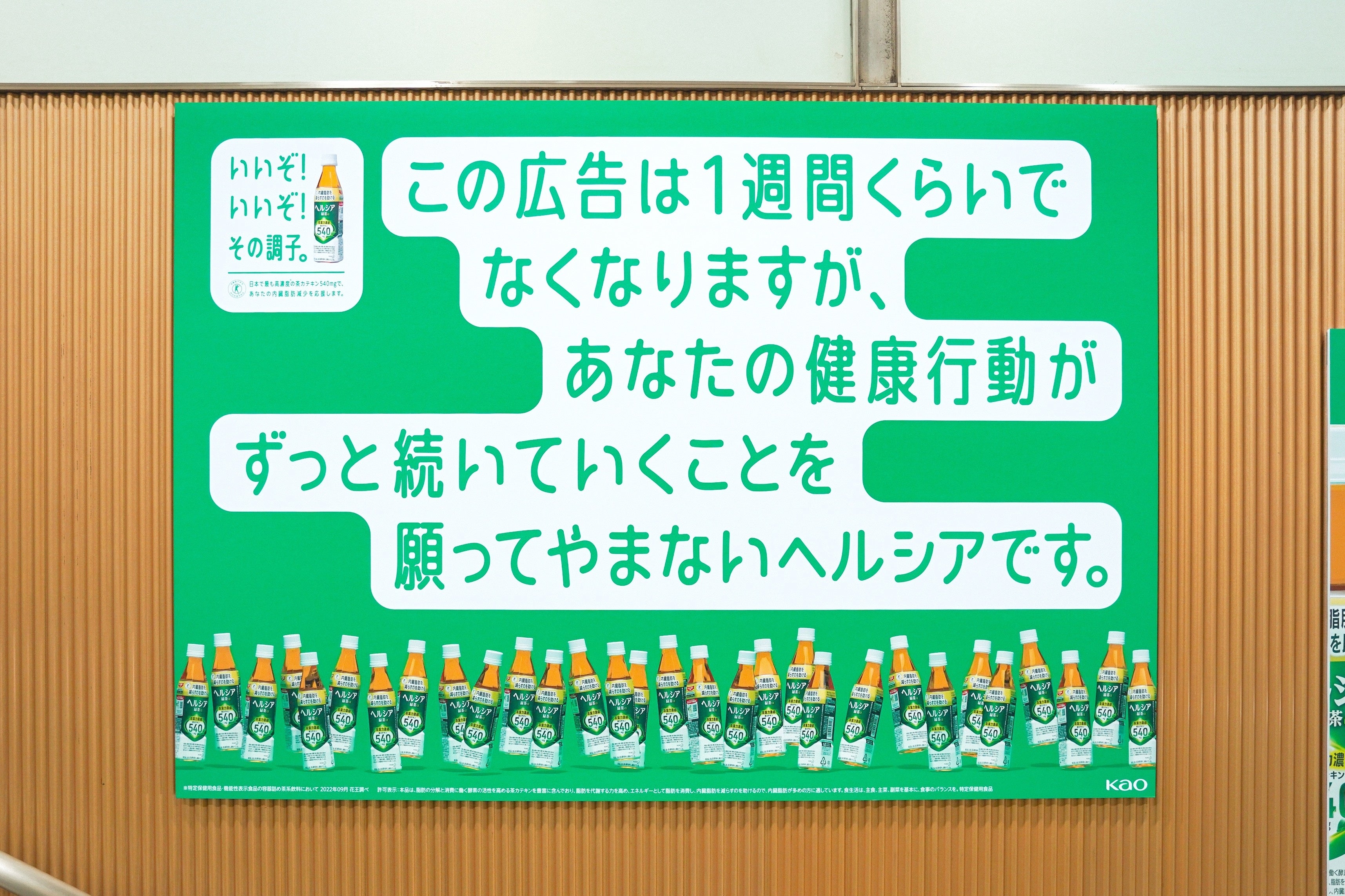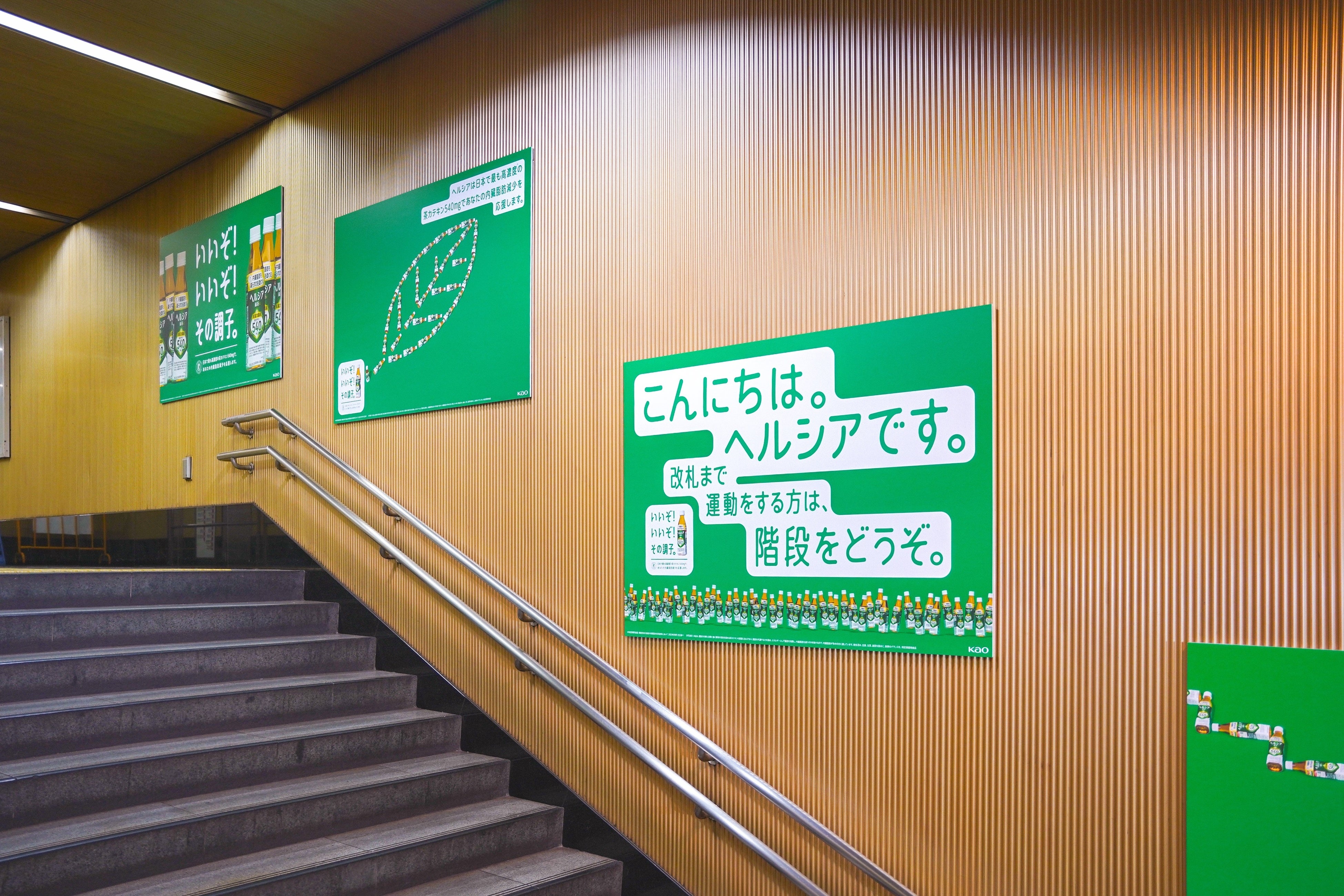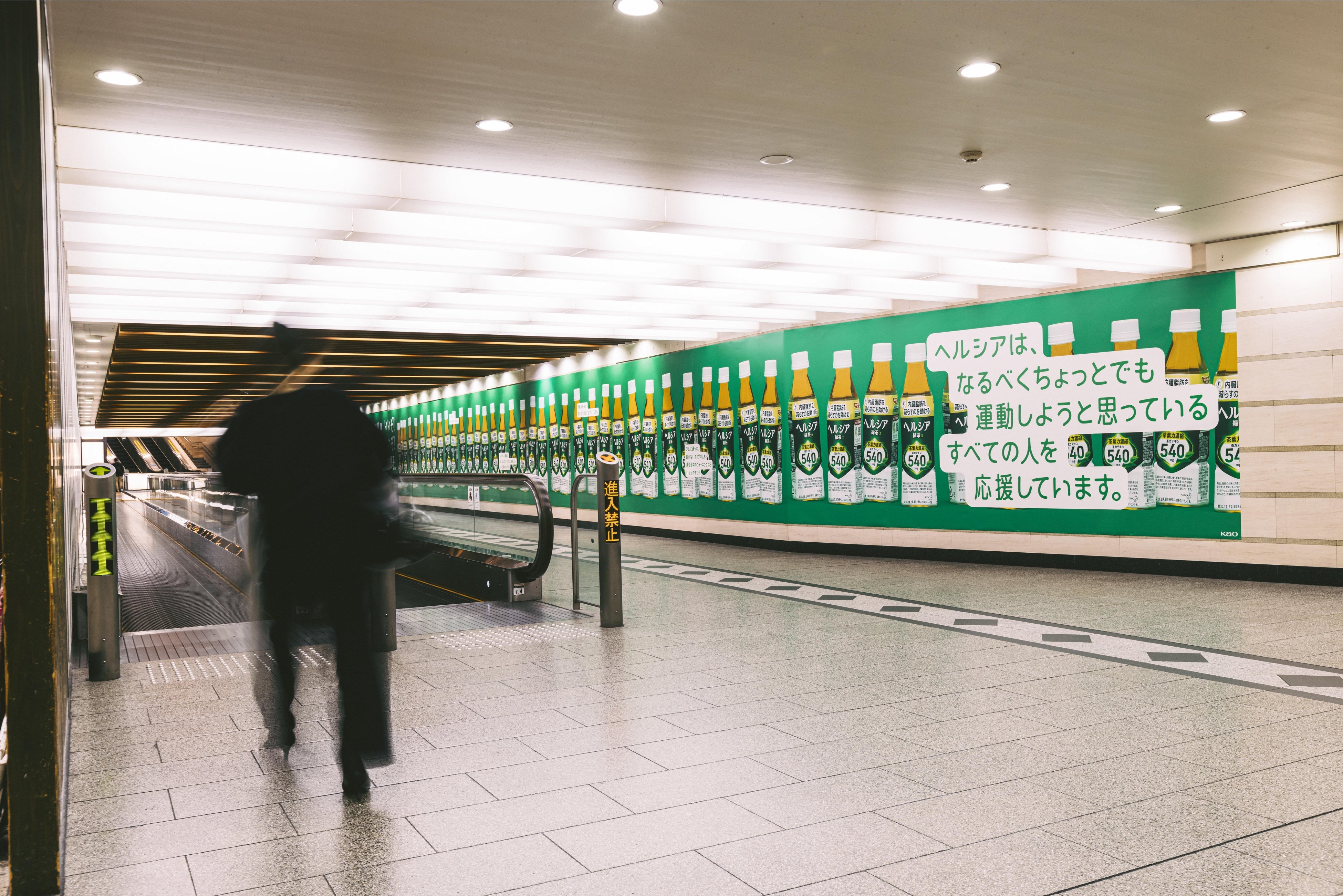 ヘルシア緑茶は、体脂肪減少を助けるお茶として2003年に発売されました。以来、名前の由来である“ヘルシーをアシストする”の通り、ブランド「ヘルシア」は内臓脂肪をはじめとした健康の悩みに寄り添い、多くの方をサポートしてきた実績を持ちます。そんなヘルシアが発売20周年を迎えるにあたり、より多くの方に日常生活の中でささやかな健康行動を継続する大切さを知っていただくべく、東京・都営大江戸線六本木駅の階段、大阪・阪急大阪梅田駅のムービングウォークに、サステナブル・エクササイズを楽しんでいただくための、様々な応援メッセージ広告を掲出しています。