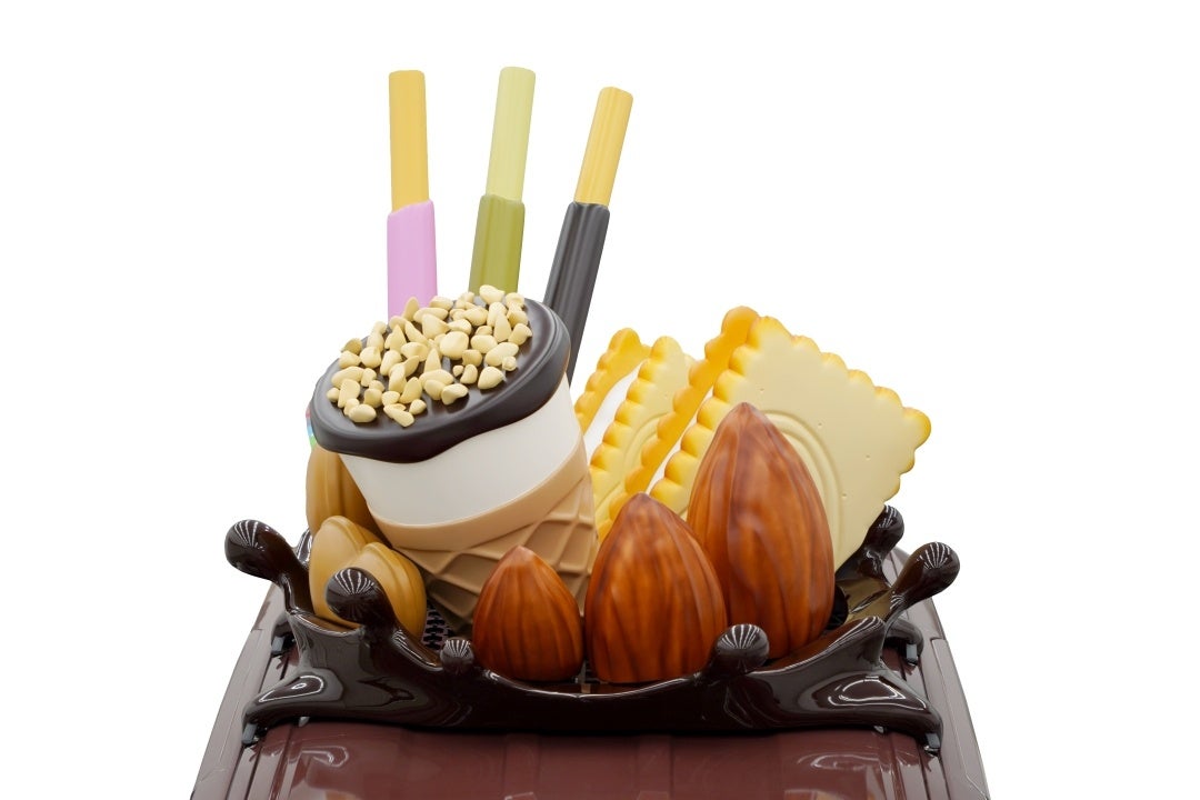 車両のデザインは子どもたちが描いたアイデアが詰まっています。車両の側面には虹を描き、ルーフにはGlicoの代表的な商品である「ポッキー」や「ビスコ」、「ジャイアントコーン」のほか、「アーモンド」をのせました。色味や質感にこだわって制作し、忠実に再現しています。