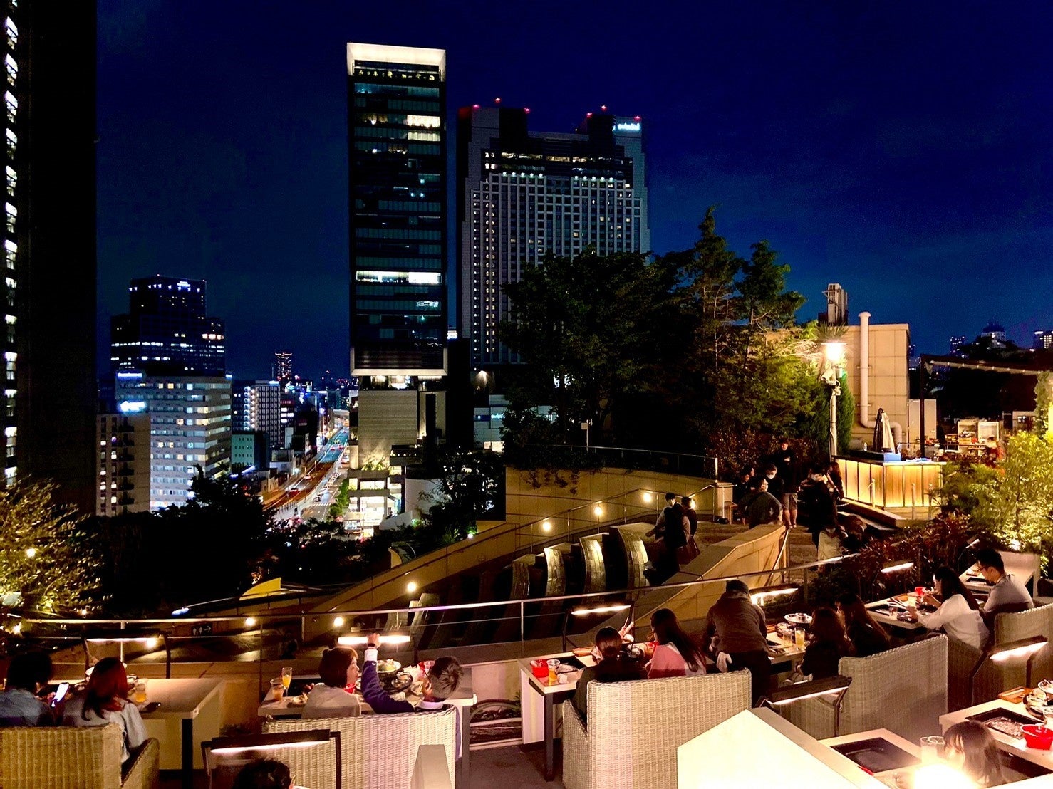 大阪ミナミの夜景が一望できる、日本初2名専用全席カップルシートのプレミアムエリアと、開放的なオープンエアの空間で、豪快なアメリカンBBQを仲間と楽しめるBBQエリア。