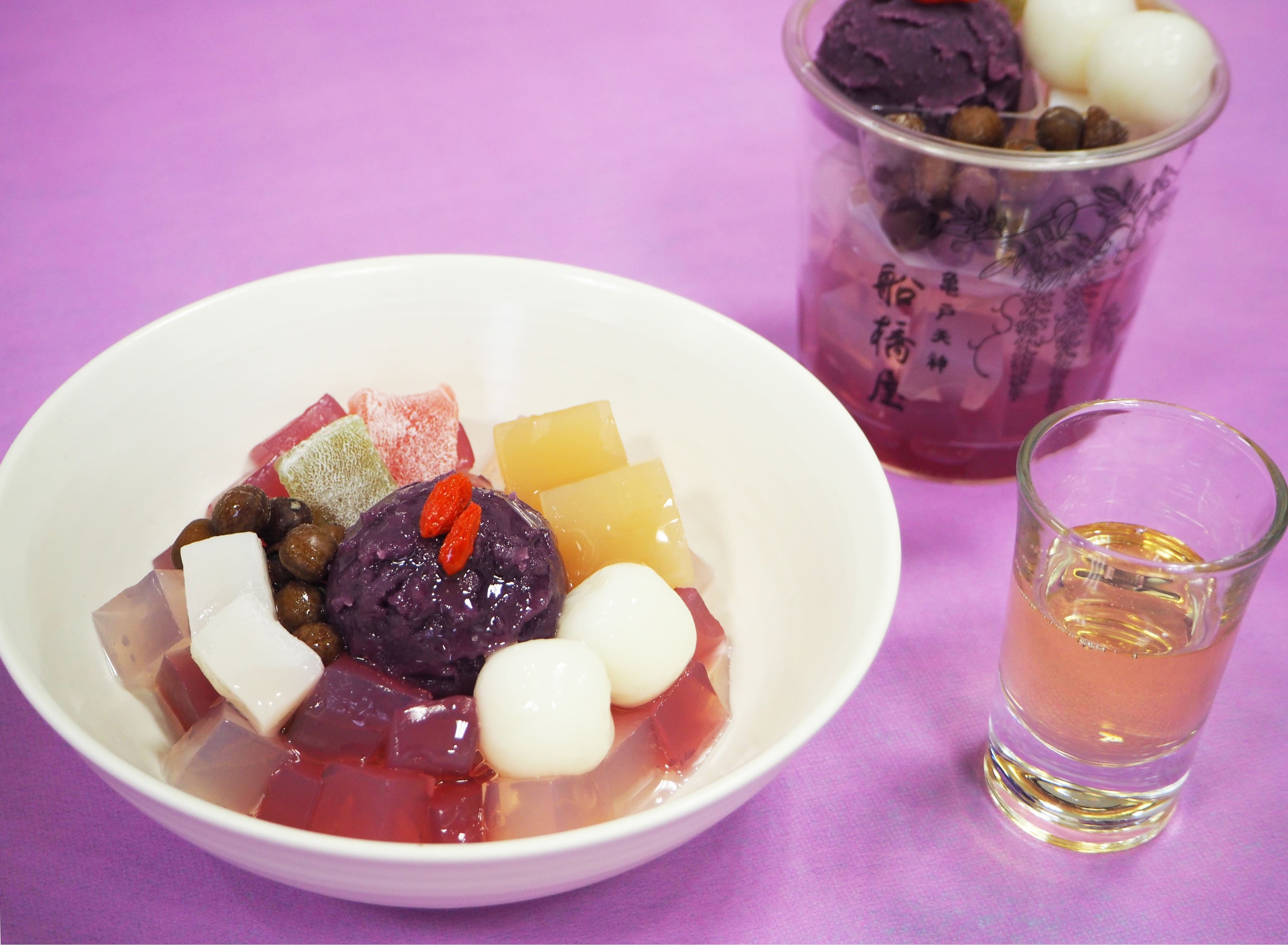 濃厚な綾紫餡と葡萄寒天で藤色のあんみつに仕上げました。素材の味が楽しめる白蜜をかけてお召し上がりください。