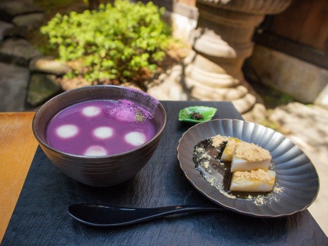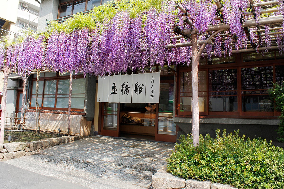 毎年大好評の「藤のおしるこ」は船橋屋特製の小豆と紫芋餡の二層仕立てに。飲むくず餅乳酸菌が配合されているので、濃厚なのにさっぱりした後味をお楽しみいただけます。白玉も加わり、食べ応えも抜群な一品です。本店店頭に咲く藤の花を眺めながら、藤のおしるこをご堪能ください。