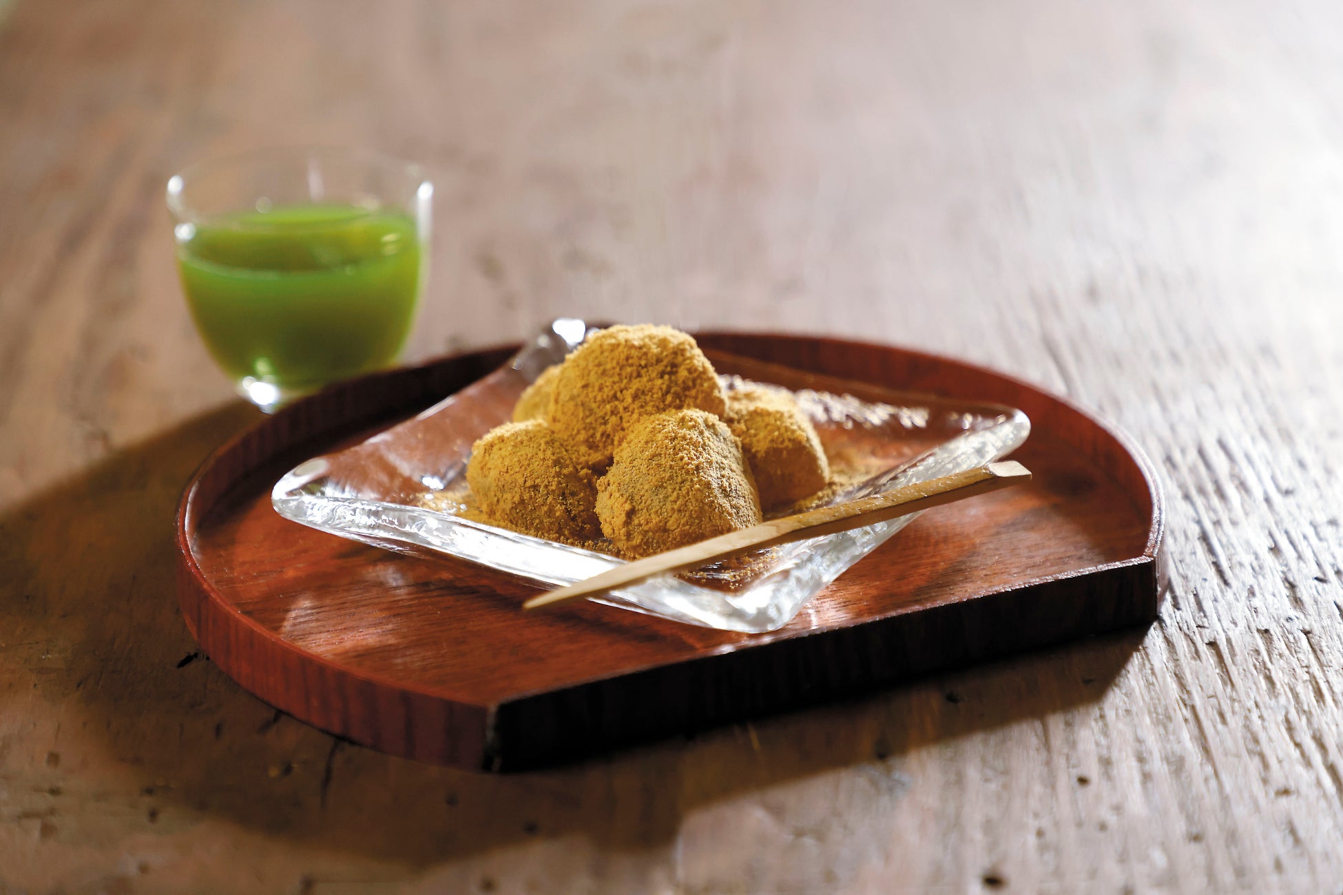 キンキンに冷やした緑茶と一緒に食べるのがおすすめです。わらび餅の食感、きな粉の香ばしさ、黒蜜のコク。三位一体となった和スイーツをぜひ、お楽しみください。