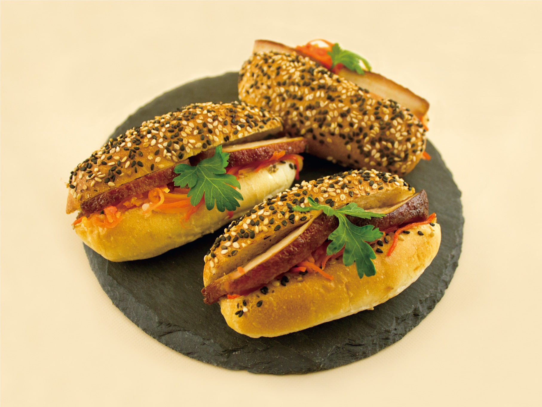 あぶり焼き豚と味噌ジンジャーフィリング、キャロットラぺをサンドしました。