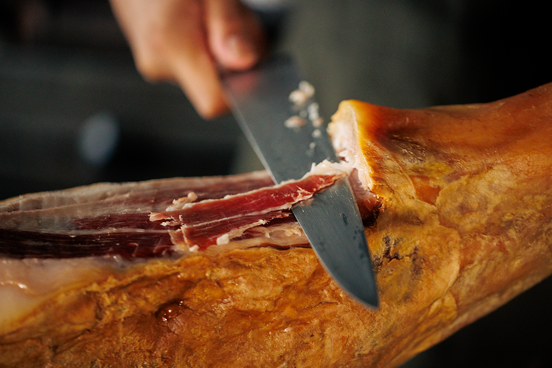 イベリア半島の固有品種の黒豚であるイベリコ豚から作られる生ハムで、口に含むと甘く溶け出し、熟成による芳醇な香りが味わえます。