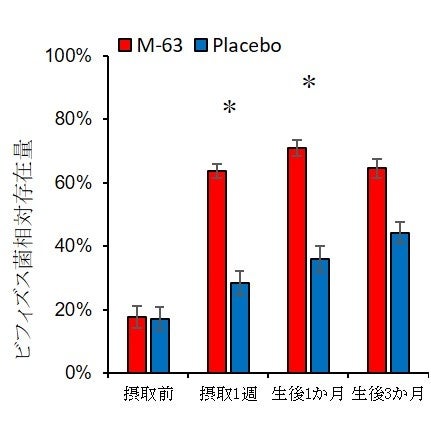・ビフィズス菌M-63摂取に起因する有害事象は認められず、新生児に対する安全性が示されました。