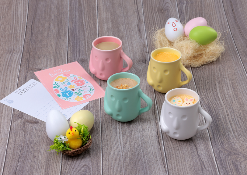 「はにわぷりんを贈ったら、『カップが可愛い』と喜ばれました」そんなお声をたくさんいただきます。イースターセットはパステルカラーが勢ぞろい。目でも楽しめるセットです。食べ終わったあとは、マグカップや植栽入れ、インテリアとしてもご利用いただけ、思い出に残ります。