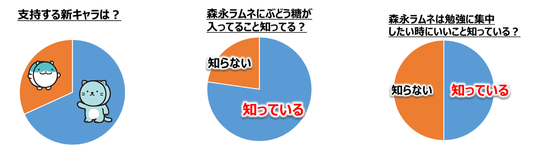 結果として、総得票数147票の内、97票を獲得した「ラムねこ」が受験生の支持を得ました。また、任意で森永ラムネへのアンケートにもご回答いただき、「森永ラムネにぶどう糖が入っていること」について、アンケート回答者中77%の受験生が「知っている」と回答。一方、「森永ラムネが勉強に集中したい時に良いこと」を「知っている」は50%に留まり、ラムネと勉強の結び付きの強化による、更なる伸長可能性も感じる結果となりました。