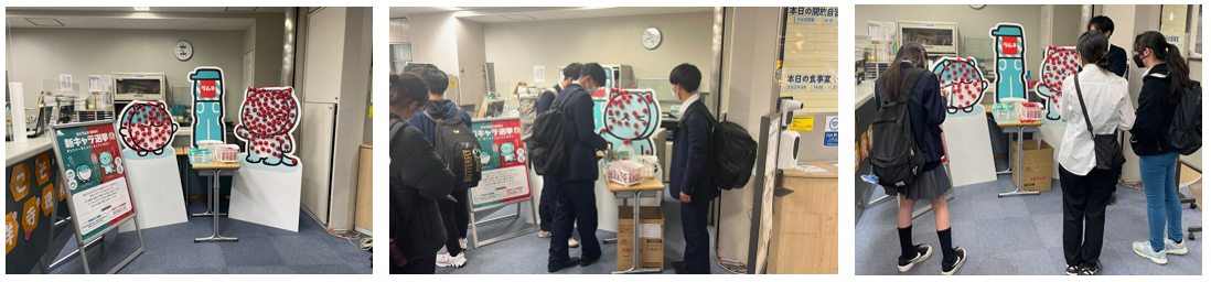 河合塾とのコラボレーションにより、吉祥寺現役館にて、新受験生に向けたリアルイベントを実施いたしました。50周年を機に、現キャラクターである「ラムネちゃん」が卒業し、新たなメインキャラクターを決める「新キャラ選挙」を特設サイトにて実施中ですが、本施策では予備校受付に新キャラである「しゅうチュー」と「ラムねこ」2体のパネルを設置し、森永ラムネサンプリングと合わせて、リアルでの新キャラ選挙を行いました。