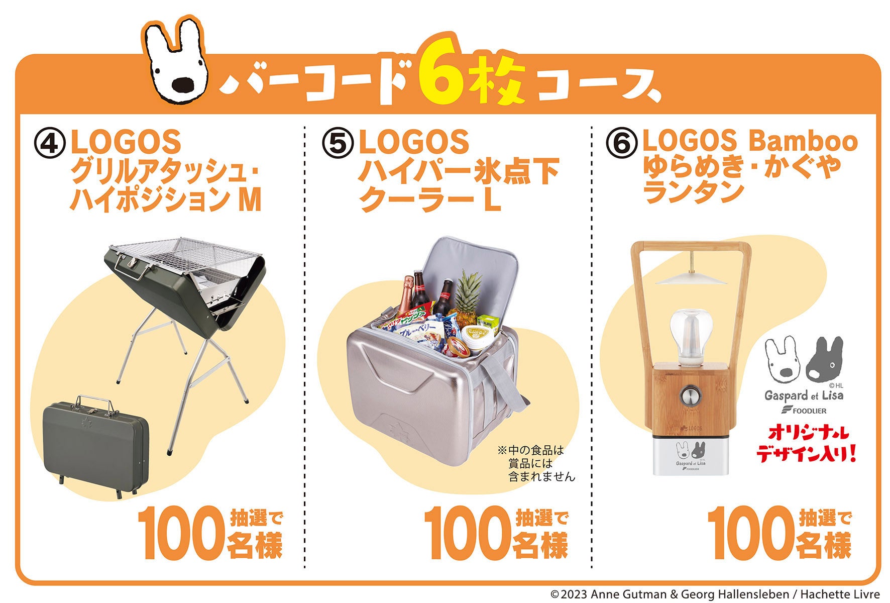 キャンペーン期間中、対象商品のバーコードを、ご希望コースの必要枚数分集めて、はがきでご応募いただくと、抽選で、キャンプで使えるロゴスグッズ&『リサとガスパール』グッズが、合計2000名様に当たります。
