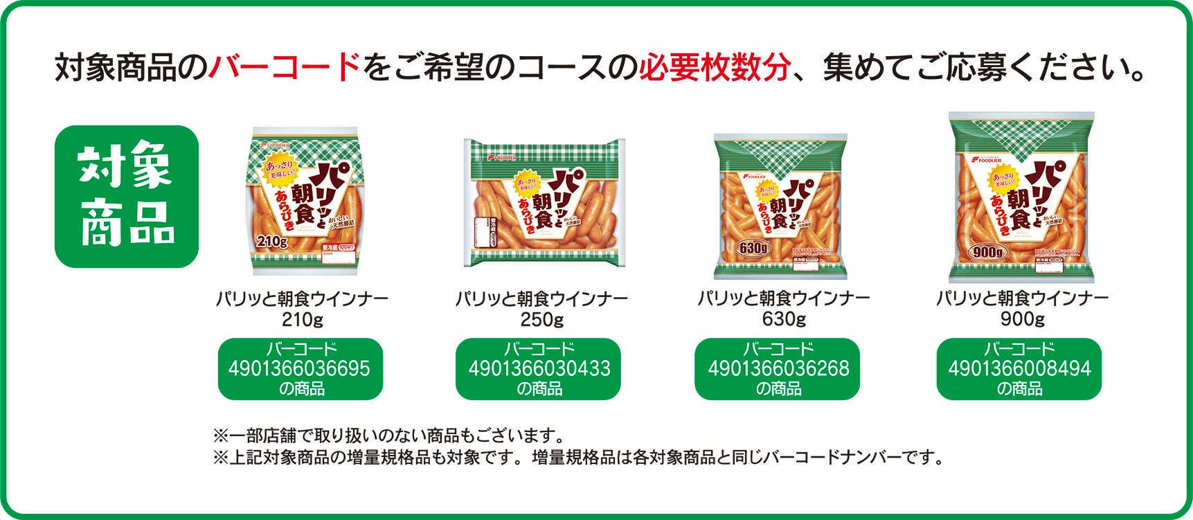 対象商品のバーコード2枚で応募できるコース、6枚で応募できるコース、10枚で応募できるコースをご用意しました。
