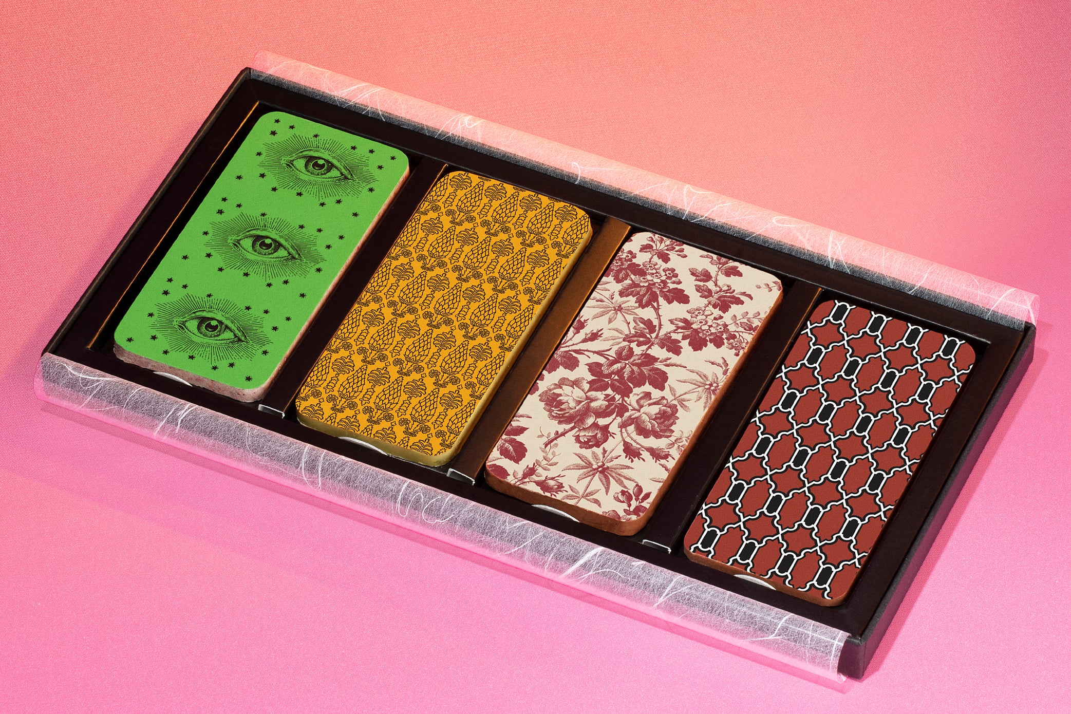 「グッチ オステリア トウキョウ タブレットチョコレート」は、それぞれに魅力を湛えながら移り変わり多彩な表情を見せる日本の季節にインスピレーションを得て、ヘッドシェフ アントニオ・イアコヴィエッロが開発を手がけました。厳選したカカオと素材を用いた4枚のタブレットチョコレートは、グッチのクリエイションにも用いられてきた美しいパターンでそれぞれに彩られ、豊かな味わいとともに視覚も楽しませます。