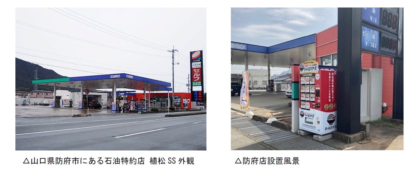 昭和33年創業の業務用麺類製造業を行う株式会社丸山製麺(本社:東京都大田区、代表取締役:丸山和浩、 https://www.maru-men.co.jp/ )が運営する、有名ラーメンの“本物のスープ”と丸山製麺の“麺”を使ったコラボ商品が購入できる冷凍ラーメン自販機『ヌードルツアーズ』( https://noodle-tours.com/ )は、山口県防府市の村重石油株式会社(所在地:山口県防府市、代表取締役社長:村重浩三)の運営するコスモ石油特約店 植松SS(サービスステーション)への導入と、明日2023年4月1日(土)より販売開始することをお知らせします。