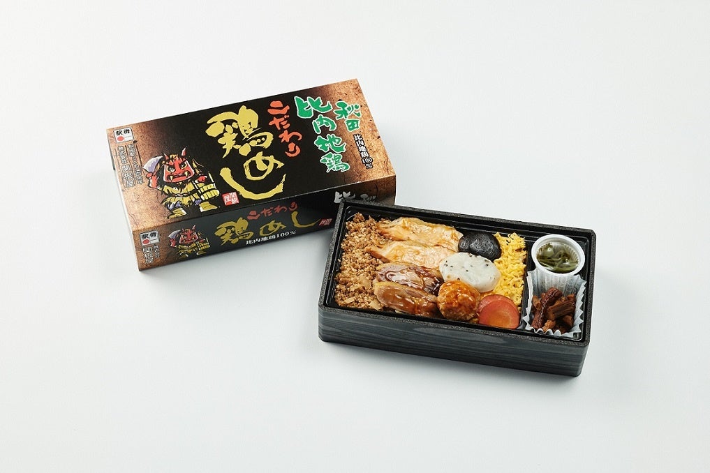 日本三大美味鶏『秋田比内地鶏』を100%使用したお弁当です。比内地鶏のガラスープであきたこまち米を炊き上げ、その上に、同じく比内地鶏の照り焼きとつくね、ゴマそぼろをのせ、比内地鶏の美味しさを満喫することができます。