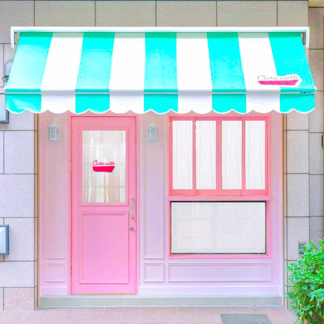 ブランドから―であるグリーンとホワイトのストライプテントにシャーベットピンクの外壁、ピンクを基調とした外観です。右側のピンクの窓からご注文頂いたケーキをお受け取り頂けます。2023年夏ごろには店頭商品販売の開始も実施する予定です。皆様の特別なケーキを準備してスタッフ⼀同お待ちしております。