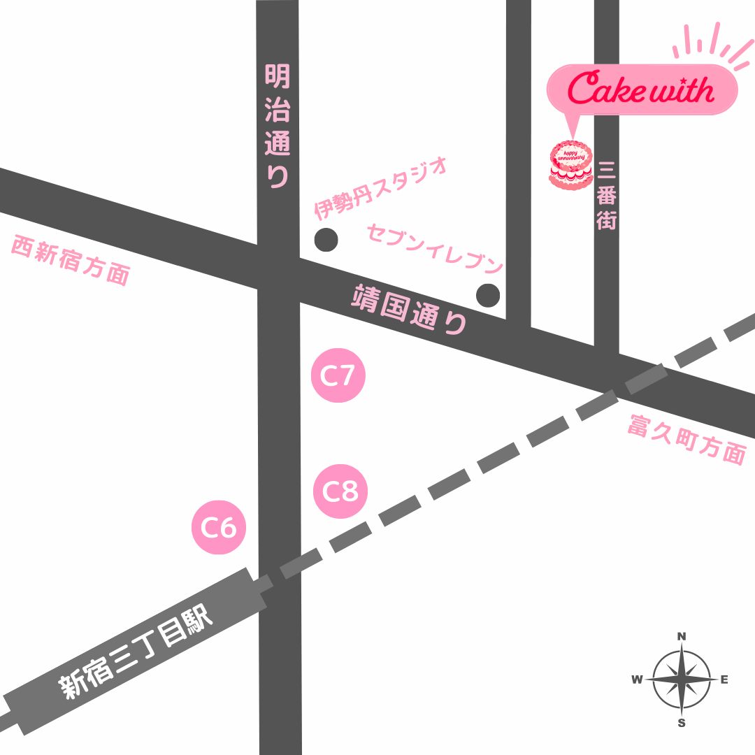 Cake withは、2021年8⽉にサービスを開始以来、定期的にケーキのデザインパターンを展開し、お客様の「かわいい」を叶えるため、アップデートしてきました。この度店頭での受け取りの需要の高まりから、交通の便もよく場所の分かりやすい新宿三丁目に路面店として出店する運びとなりました。