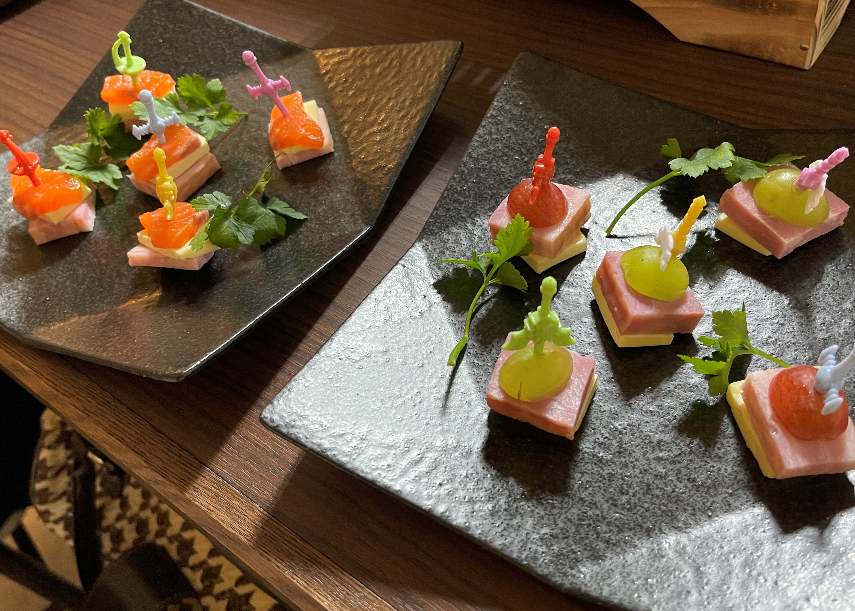 バータイム:ピンチョス、クリームチーズ、ポテトサラダ、ハッセルバック、ミックスナッツ、サツマイモとチーズのステック、雑煮、真夜中の甘味、本日のオススメの一品