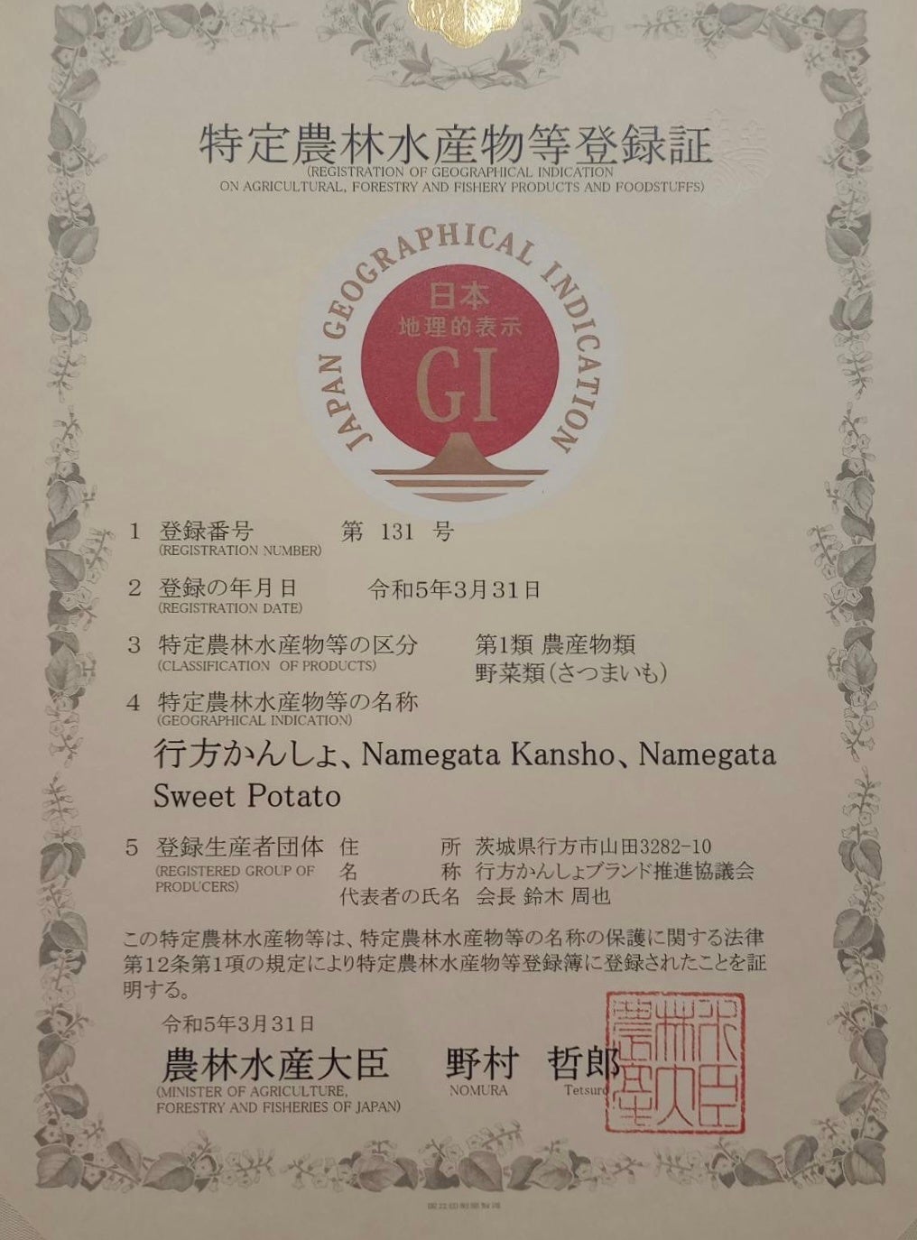地理的表示(GI)保護制度への登録を目指し、行方かんしょブランド推進協議会が令和2年度に登録申請をしておりました『行方かんしょ』が今般、登録となりました。