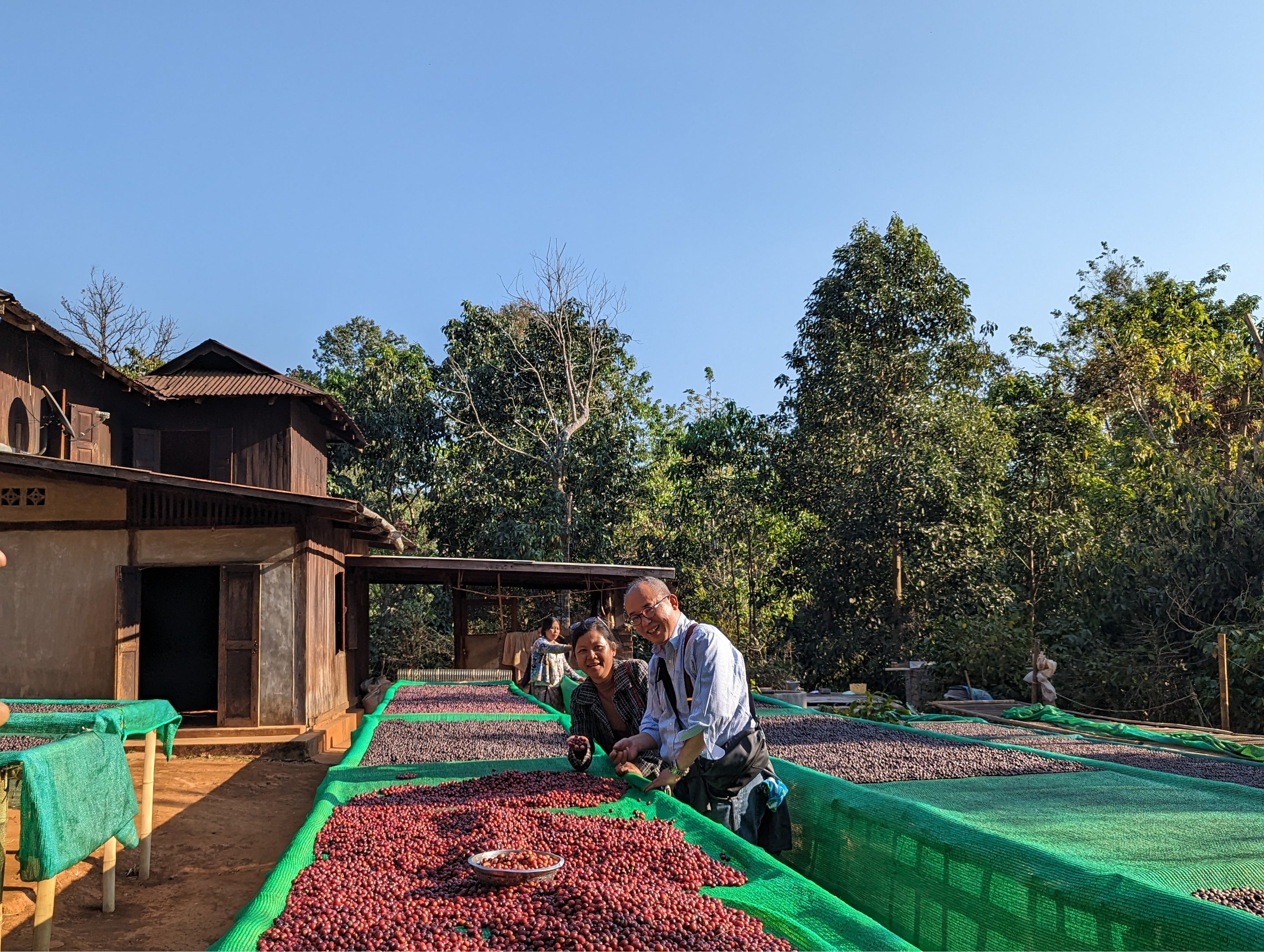 ミャンマーの少数民族ダヌー族の出身で、3代続くコーヒー農家に生まれたSu Su Aungさんが「自分たちの土地で栽培し、地元の労働力で生産したコーヒーがもたらす利益を地元に還元したい」という想いから、2016年、地元の農家の女性50人で立ち上げたコーヒー生産者グループ「Amayar Women’s Coffee Group」。ビーンズ・コネクティッド株式会社が展開するコーヒー焙煎ビジネスプラットフォーム「RoCoBeL」では彼女たちが生産するコーヒー豆をフェアトレードで毎年3トン仕入れて、国内で焙煎しています。今回は「ミャンマーコーヒーの里帰り」を実現すべく、その焙煎豆とドリップバッグに加工した商品を持って、ミャンマーのユワンガンの町にある「Amayar Women’s Coffee Group」を訪問しました。ミャンマーではいまクーデターが起こっていて、少しビクビク緊張しながらの訪問ではありましたが、何事もなく、逆に素晴らしい大自然と青い空、澄んだ空気、そして人々の笑顔に癒される旅でした。また、地元のコーヒー農家の人や仲買人、若いコーヒー・プロデューサーの人たちとも交流してきました。
