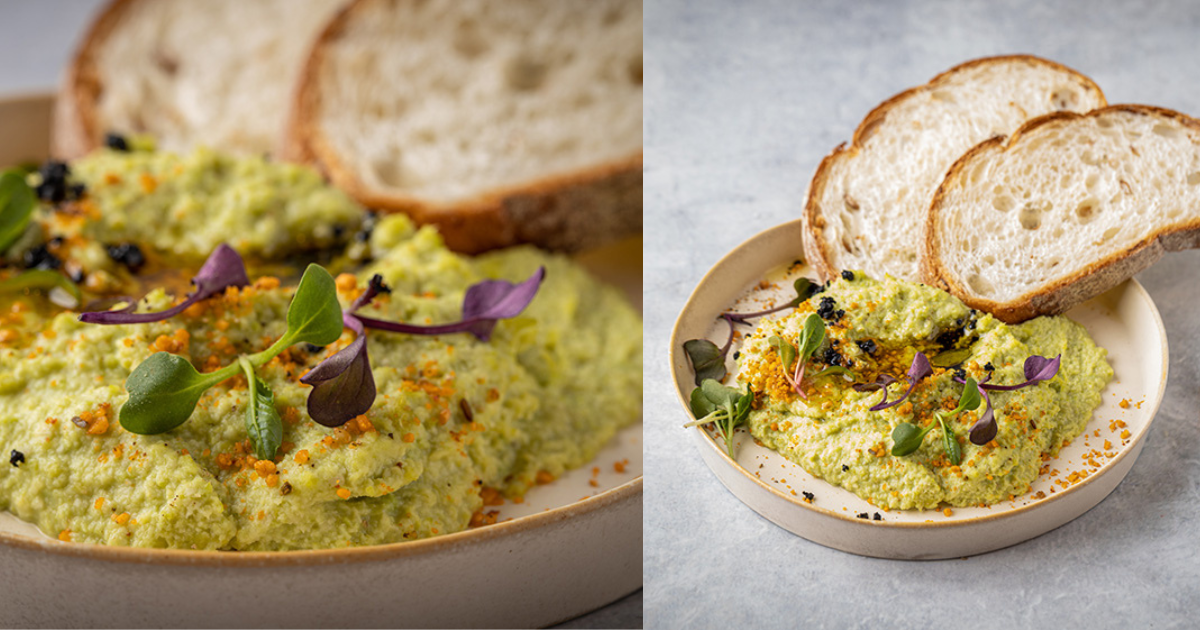 こちらは、ビーガンメニューの枝豆のフムス。フムスとは中東の地域でよく食べられるペースト状のサラダで海外ではフムスをひよこ豆で作ることが多いのですが、こちらは枝豆をメインに使っています。