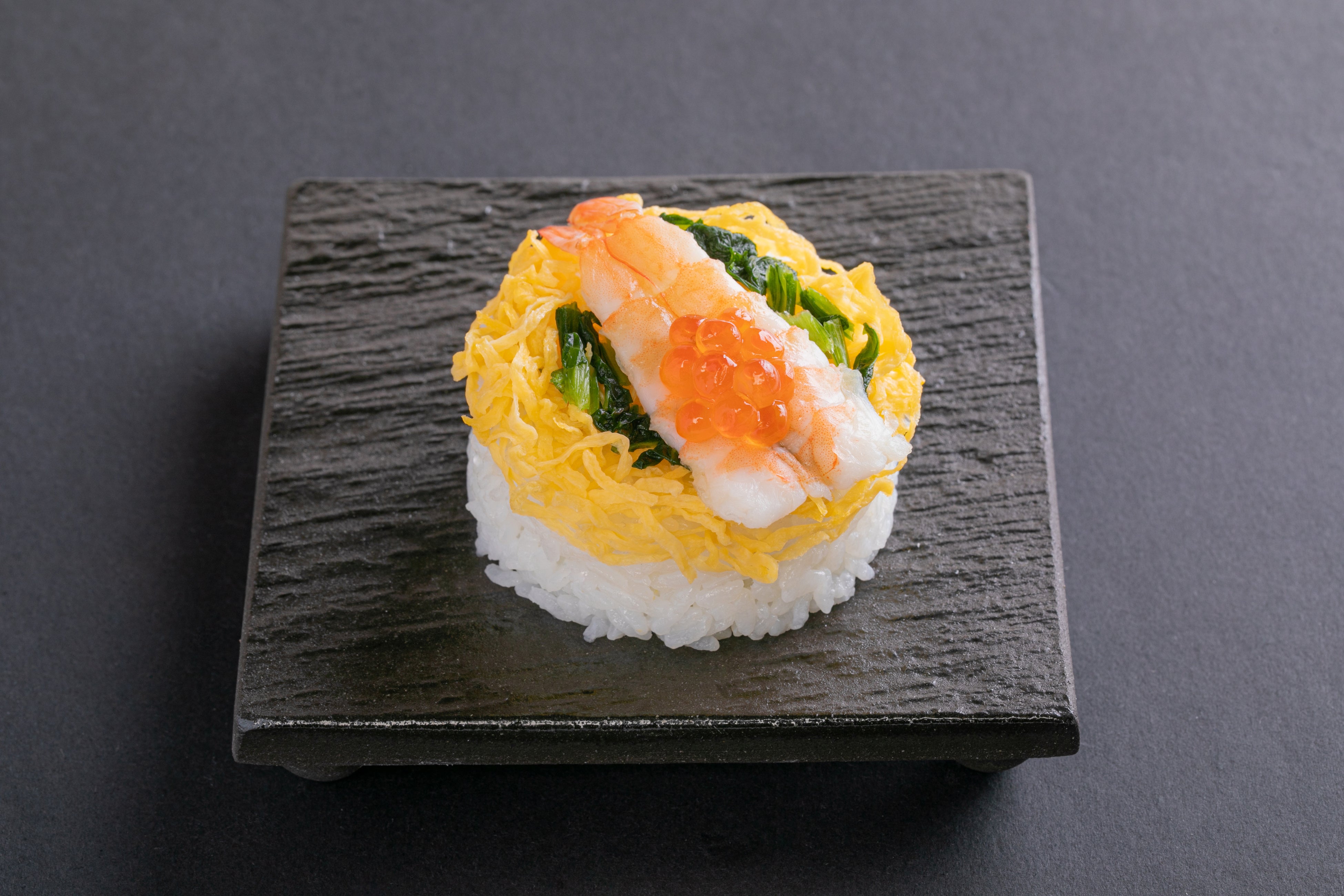 炎舞炊きで炊き上げたすし飯を、ちらし寿司風に仕立てました。華やかな見た目で心躍る一品です。