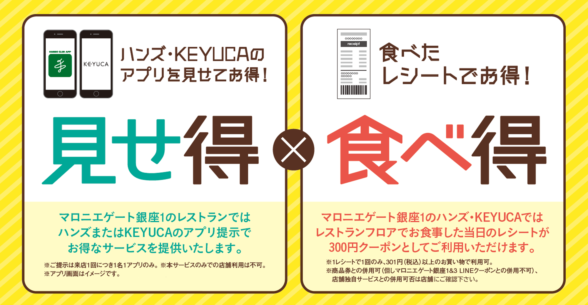 マロニエゲート銀座1のレストランにて、ハンズまたはKEYUCAのアプリをご掲示いただけるとお得なサービスをご提供いたします。