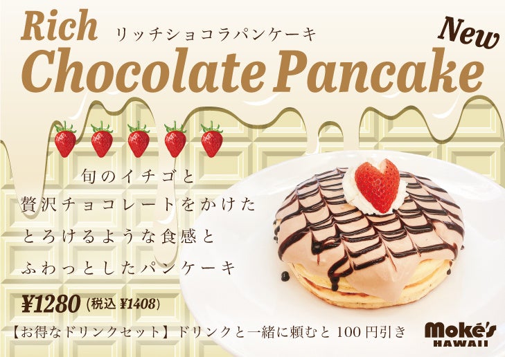 ハワイでも大人気のカフェ「Moke’s」日本の江ノ島店で新しいパンケーキが新発売しました。旬の苺を贅沢に使いながら、贅沢にチョコレートをトッピング。見た目も心も満足するおいしいパンケーキをぜひご賞味ください。